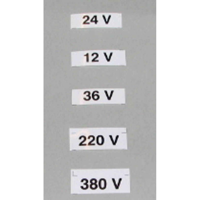 Lipdukas - ženklas "12V", "24V", "36V", "42V", "230V", "400V". Išmatavimai: 12x35 mm. Viename lapelyje būna vieno nominalo 20 vnt.