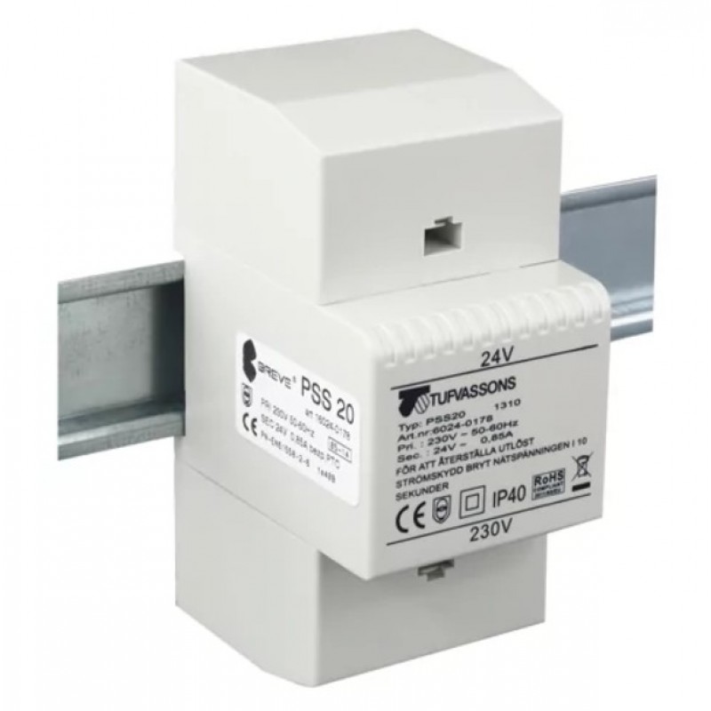Uždaros konstrukcijos transformatorius, pagrinde naudojamas įrenginiuose, kur yra T-35 bėgelis (DIN). IP40. Galia: 20 VA. Įtampa: Pirm. 230 VAC, Antr. 24 VAC.