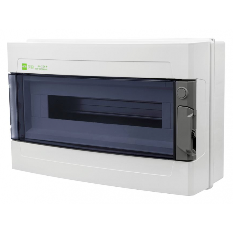 Paskirstymo skydas, virštinkinis, skaidriomis durelėmis, 1x19 modulių. IP55. Komplekte su N+PE gnybtais.