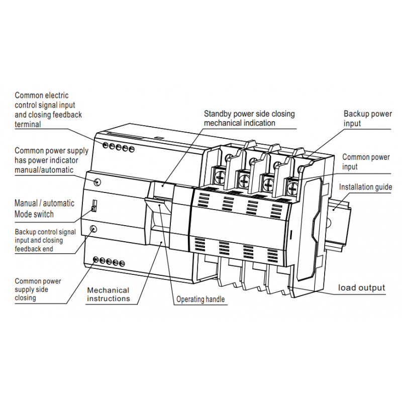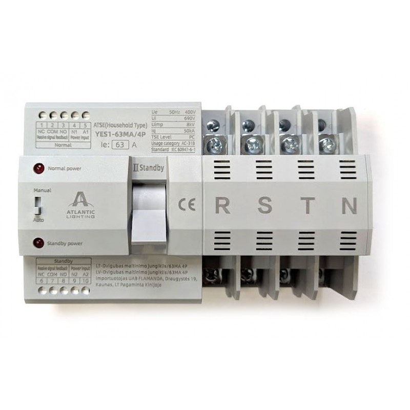 - Apsauga ir blokuotė: Integruotas mechaninis ir elektrinis blokavimas apsaugo nuo abiejų maitinimo šaltinių įsijungimo vienu metu, taip garantuojant sistemos saugumą.