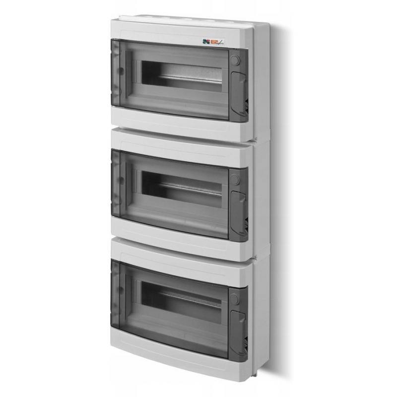 Paskirstymo skydas, virštinkinis, skaidriomis tamsiomis durelėmis, 3x12 modulių. IP40. Komplekte su N+PE gnybtais.