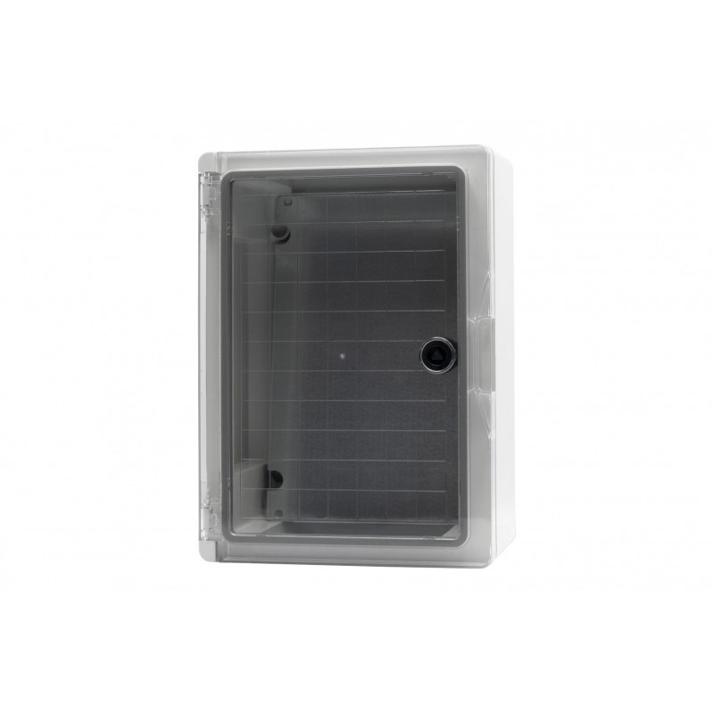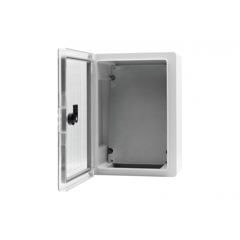 Paskirstymo skydas, plastikinis, su montavimo plokšte, IP65, skaidriomis durimis. Rakinamas. 280x210x130 mm.