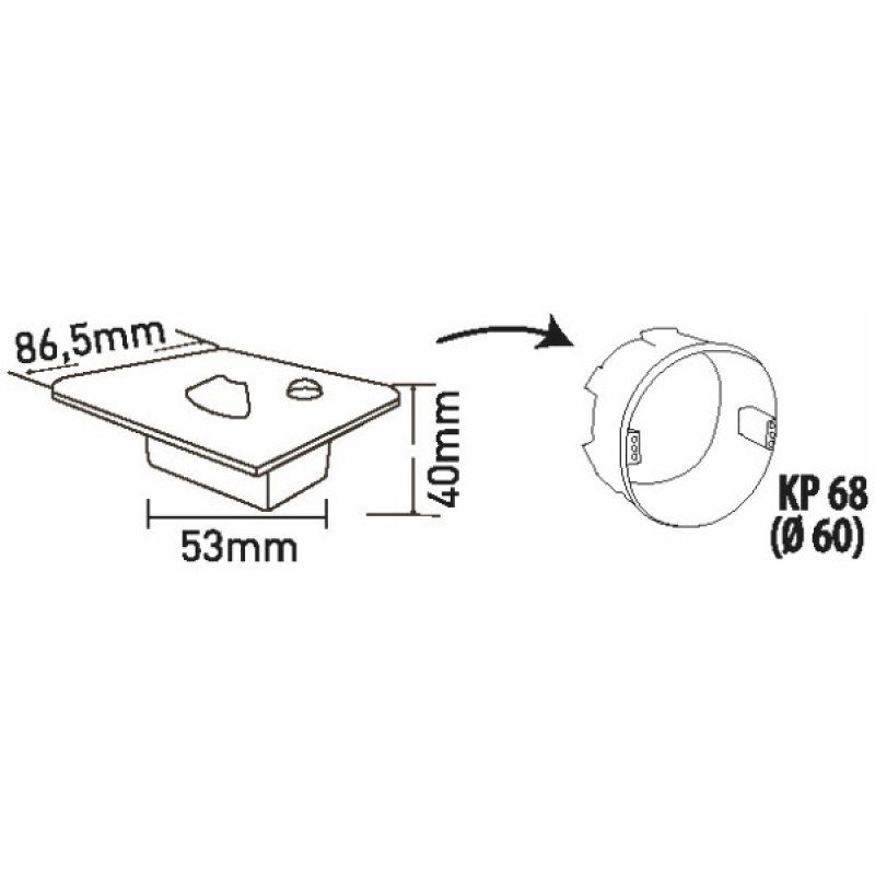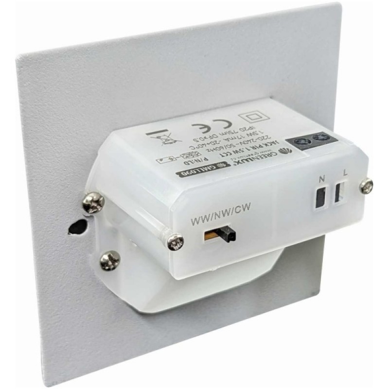LED šviestuvas. Įleidžiamas. Maitinimas: 230V. Galia: 1,5W. Šviesos srautas: 75 lm (Reguliuojamas). Šviesos spektras: 3000/4000/6000K (Reguliuojamas). Su PIR judesio davikliu - jutikliu.